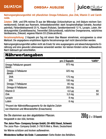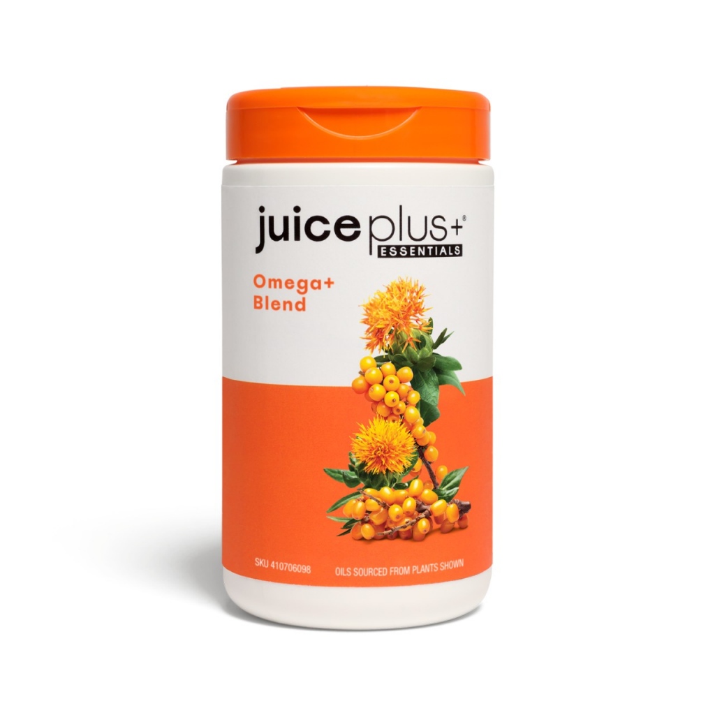 Juice Plus+ Essentials Omega+ Blend ist eine pflanzenbasierte Kombination aus den Omega-Fettsäuren 3, 7 und 9 sowie Vitamin D, Zink, Lutein und Lycopin. Die Omega-Fettsäuren werden aus Zutaten wie Obst, Algen und Samenölen gewonnen. Die Omega-3-Fettsäuren in Omega+ Blend werden aus der nachhaltigen und veganen Quelle gewonnen: Algen!