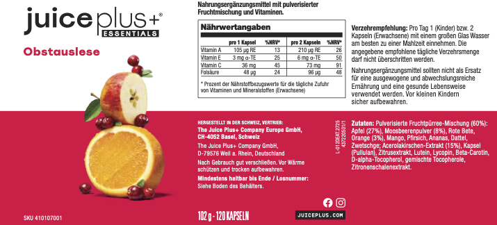 Juice Plus+ Essentials Obst- und Gemüseauslese Kapseln, der Klassiker für eine sinnvolle Versorgung mit wertvollen Pflanzenstoffen. 18 unterschiedliche Obst- und Gemüsesorten, auf dem Höhepunkt ihrer Reife geerntet und durch ein firmeneigenes Verfahren schonend verarbeitet. Für ein Maximum an wertgebenden Inhaltsstoffen - jeden Tag.